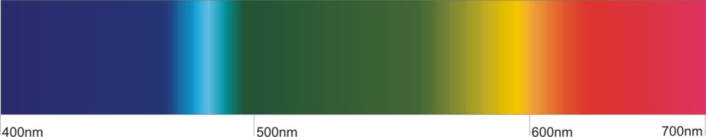 Ebenso hilfreich ist die Orientierung wie man sie später noch erfahren wird in den jeweiligen Wellenlängen. Kurzwellige Farben finden sich ab 400 nM und sind von dunklem blau beginnend. Sie gelten daher auch als kalt. 700 nM sind am anderen Ende des Farbspektrums, sind eher rot und damit auch warm. So als würde man sagen, niedrige Wellenlänge, niedrige Temperatur, hohe Wellenlängen, hohe Temperatur. Der physikalische Hintergrund hinter den später zu erläuternden Wirkungen.